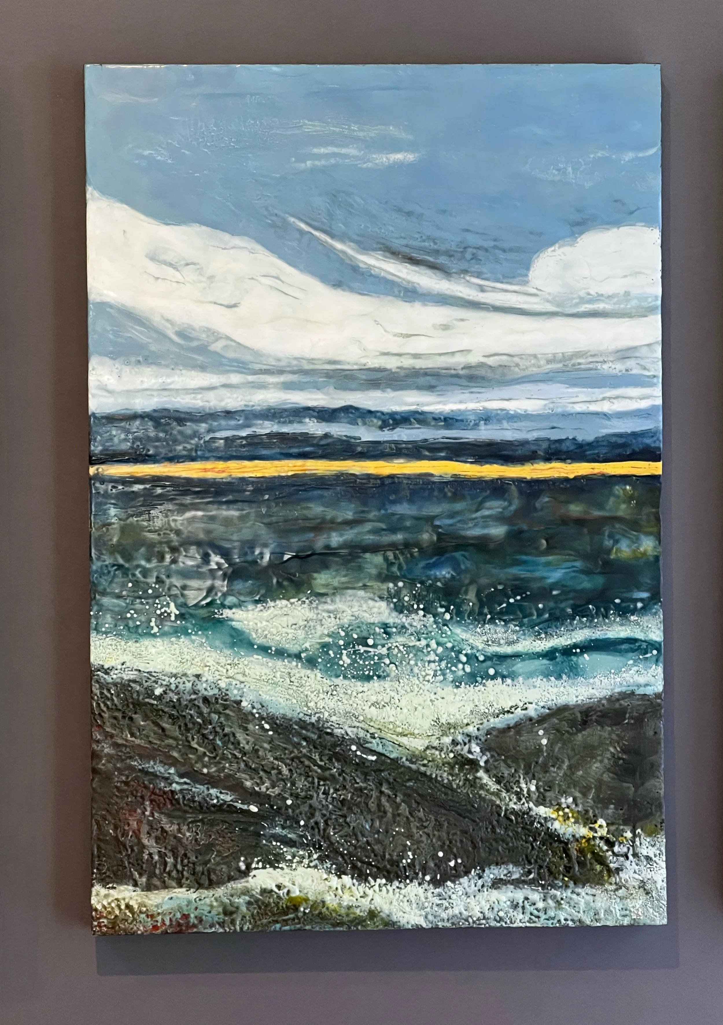 The surprise came from things feeling out of order. My encaustic skillset is newer than watercolor, so the idea that I’d learn something about watercolor by working in encaustic was unexpected but also exciting.